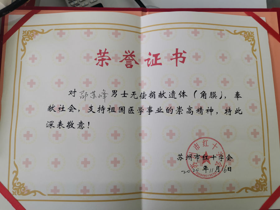 得知他的情况和困难后,苏州市“看见吴中”公益基金会表示愿意提供经济援助,然而,角膜供体又成了问题。幸运的是,邵苏峰离世捐献的眼角膜让他看见曙光。