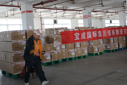 4月27日,台企宝成国际集团捐赠的1633箱价值1000万元的运动鞋和运动服正式装车,28日正式发车。这是宝成国际集团继向灾区捐赠1000万元善款后又一义举。集团相关负责人表示,在地震发生当天就作出决定捐赠1000万元现金用于救灾,后来通过咨询灾区得知需要运动鞋和运动服,所以又决定再捐1000万元的物资。他说:“两岸血浓于水,为灾区人民出钱出力,这也是台商应该做的。”