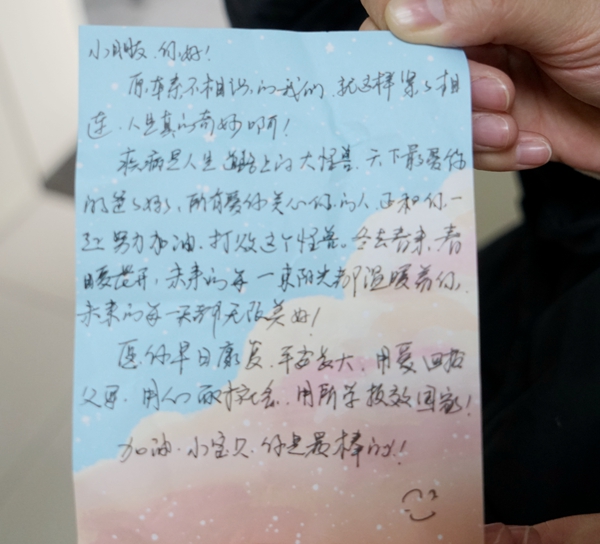 捐献当天,严军听到患者所在医院代表带来的感谢信后,眼眶有些泛红。他拿出自己前一天写好的祝福信,拜托医院工作人员带给小患者。信上说:“愿你早日康复,平安长大,用爱回报父母,用心面对社会,用所学报效国家。”