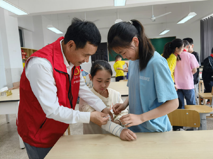 区红十字救护培训师钱红卫为师生带来一场精彩的救护讲座。钱老师讲述了“人道、博爱、奉献”的红十字精神内涵,随后讲授和演示了包扎技术。小安全员们分组合作尝试,在钱老师的指导下,学会了简单的上肢包扎和头部止血包扎技巧。小伙伴们相互鼓励,大胆展示,学会了包扎技术特别开心,各个笑脸绽放。