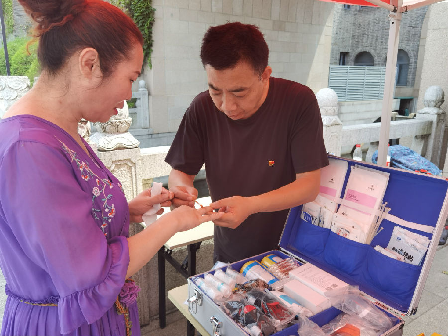 6月中旬,一位市民在相门城墙附近游玩,不小心划伤手指。市红十字会的党员志愿者看到后,立即对伤口进行消毒处理,市民笑着说道:“这下我就放心了!”除了为受伤市民进行急救外,党员志愿者们还在现场发放红十字运动、无偿献血和造血干细胞捐献、遗体(器官、角膜)捐献等知识的宣传折页,并针对市民的咨询进行详细解答。耐心的服务态度和专业的知识讲解,获得了市民朋友的一致好评。