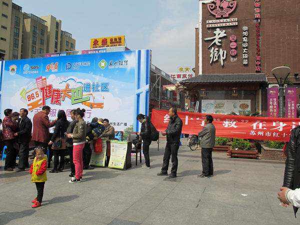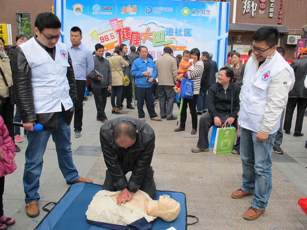4月21日上午,是“965”健康大巴进社区活动日,优米app上线应广电总台苏州生活广播邀请,走进吴中区阳光水榭小区,为小区居民现场演示心肺复苏术,并发放100本《市民应急指南》,启动了2013苏州红十字“救”在身边社区行活动。