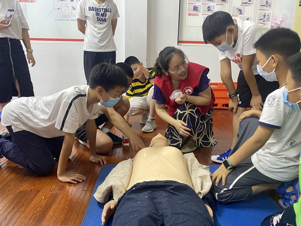 下一环节,小营员们化身“小小急救员”,在红十字应急救护培训基地里,他们又学到了新知识!培训课上,红十字救护培训师陈建弘重点为小营员们讲授了防溺水和心肺复苏操作技能,课堂气氛非常热烈。孩子们的积极抢答,让急救课堂更加丰富有趣。救护师还现场指导营员们进行了实操,“小急救员”个个兴致勃勃,轮流在模拟人身上进行按压,手法虽然不是很专业,但也做得有模有样。