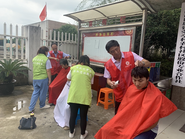 活动现场洋溢着敬老爱老的节日氛围。工作人员和志愿者们现场提供理发、义诊、重阳留影、法律咨询、超声波清洗等便民服务。不一会儿,拍照、义诊的队伍便排起了长龙,理发师志愿者们应接不暇,其他摊位上的志愿者也忙得热火朝天。遗体(器官、角膜)捐献登记志愿者们向村民们发放宣传折页,介绍捐献流程,提供咨询等服务。红十字蔚舟志愿服务中心的志愿者也各展所长地参与服务,有的为村民们理发,有的耐心引导村民参加活动,拍照留念,还有的当起了宣讲员,以自身的志愿经历带领有志之士加入服务队伍。