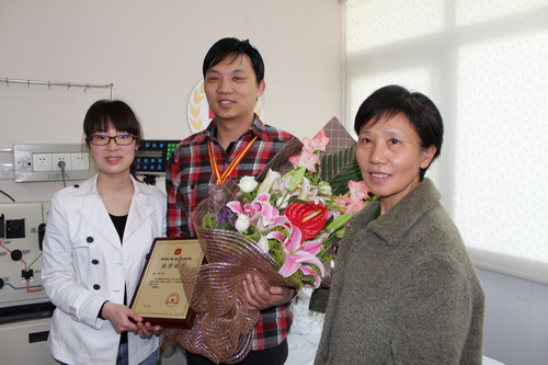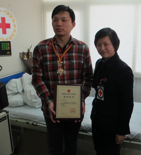 (市红十字会秘书长马红英为苏州“最帅新郎”蔡雨颁发荣誉证书)