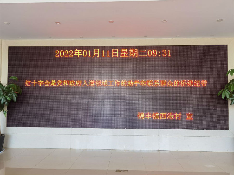 “红十字事业是中国特色社会主义事业的重要组成部分”,1月1日起,在冶金工业园(锦丰镇)各村(社区)的办事大厅门口,老百姓都可以在醒目的LED电子显示屏上看到这样的宣传标语。进一步增强了全民意识,切实为《江苏省红十字会条例》宣传营造了浓厚的氛围。