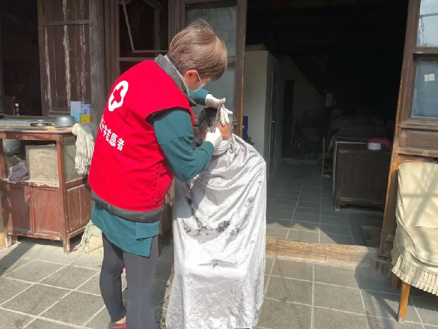 疫情期间,好多理发店停业,导致很多老人没办法出门理发。姑苏区虎丘街道桐星社区安排红十字志愿者上门,为行动不便的孤老、残疾人义务理发。