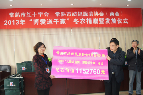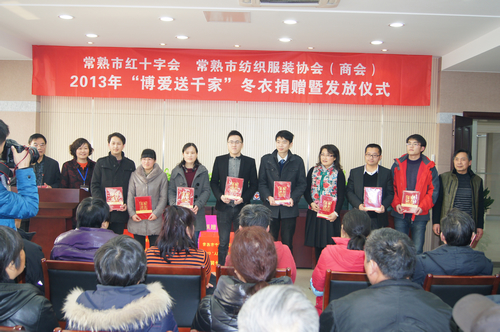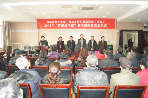 1月30日,2013年“博爱送千家”冬衣发放仪式在常熟市虞山镇琴湖管理区举行。常熟市纺织服装企业本着博爱奉献,回报社会,共建和谐社会的宗旨向常熟市红十字会捐赠了110多万元爱心冬衣。