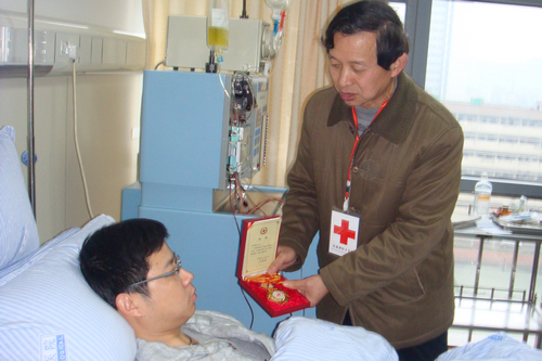 21日上午,常熟市红十字会、住建局的慰问人员和金志铭父母亲一起来到南京东南大学附属中大医院看望金志铭。今年36岁的金志铭是常熟市路灯养护所所长、党支部书记,新年伊始,他成为苏州市第72位暨常熟市第6位造血干细胞捐献者,也是全省住建系统首位造血干细胞捐献者。在采集现场,江苏省红十字会常务副会长张立明给金志铭颁发了捐献造血干细胞荣誉证书和奖章,并对金志铭说:“感谢你,我代表中华骨髓库给你颁发这个荣誉证书,你是全国第3271位捐献者。”