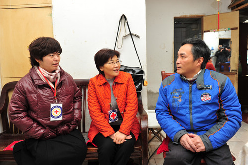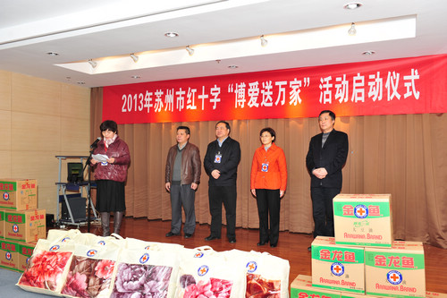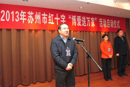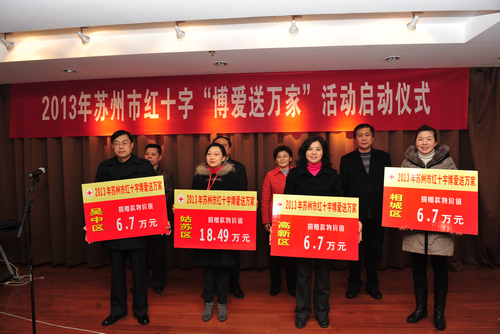 2013年元月11日早上,寒风凛冽,姑苏区四季晶华社区内却一片暖意融融,来自苏州城区的近百名群众聚集在此,参加由市红十字会举办的2013年“博爱送万家”启动仪式。市政府副市长、市红十字会会长王鸿声宣布活动正式启动,市红十字会常务副会长严晓凤、姑苏区副区长胡岚、友新街道党工委书记邹海明等领导向吴中、相城、姑苏、新区的困难群众代表送上了救助金,还上门看望了友联一村的徐望辉。徐先生因患小儿麻痹症导致肢残,经鉴定丧失劳动能力三级,儿子读初中,全家停靠妻子打零工维持生活,2002年1月进低保。拿到红十字会的救助款物,徐先生很是感谢。