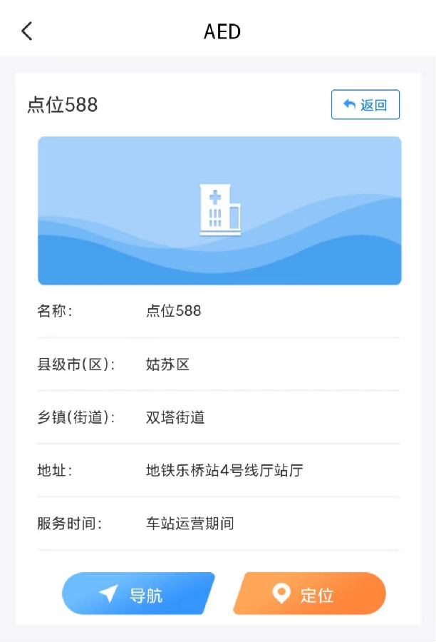 市民可在“苏周到”App首页点击进入“AED点位”,查看分布图以及各点位详情。在地图模式下,全市所有的AED点位一目了然,可以直观地找到离自己最近的AED点位,点击地图上的绿色图标便可查看点位的地址、服务时间等详细信息,还可以直接导航到点位。