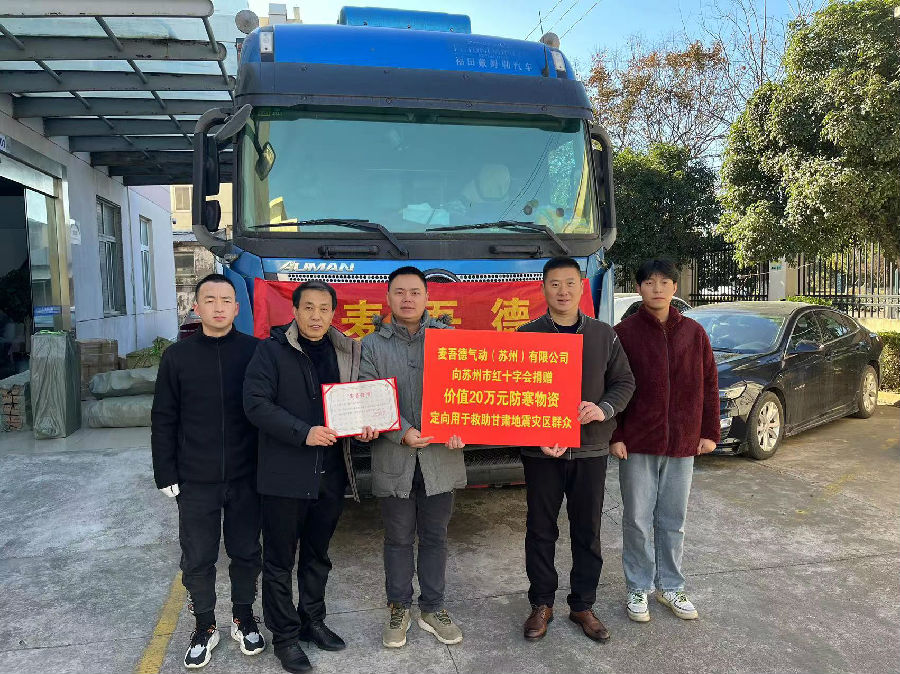 苏州麦吾德气动(苏州)有限公司第一时间在公司发布向灾区捐款捐物的倡议书,全体员工积极响应,两天时间紧急筹措了价值20万元的救灾防寒物资,专车运往积石山灾区。