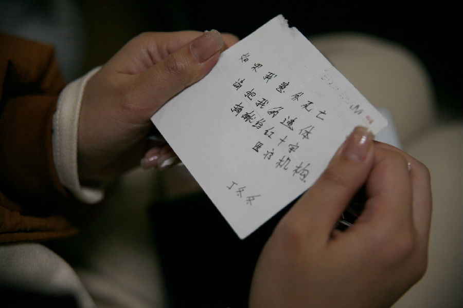 “在公益的道路上前行,争取做一个对社会有用的人!” 早在丁冬冬18岁时,他在电视上看到有人因病去世后捐献的器官、角膜拯救了多名患者,于是他的钱包里一直放着一张小纸片,至今仍保存完好,上面写着:“如果我意外死亡,请把我的遗体捐献给红十字。”2020年,丁冬冬在中国人体器官捐献平台完成了志愿者登记,正式成为一名光荣的捐遗登记志愿者。