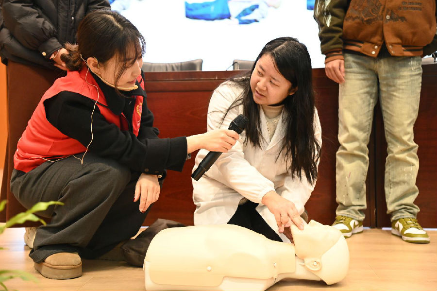 培训内容丰富实用,涵盖了多项急救知识。为了让师生们更直观地学习,培训现场设置了示范环节和邀请教职工实践学习环节。红十字救护培训师演示心肺复苏、AED使用及气道梗阻急救的规范操作,边操作边讲解动作要领。部分教师进行了实操练习,在实践中巩固所学知识,进一步提升了急救技能。