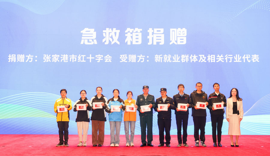 活动现场,多部门共同启动张家港市应急志愿服务进社区活动。市红十字会向新就业群体及相关行业代表捐赠急救箱,开展了AED设备演示培训。