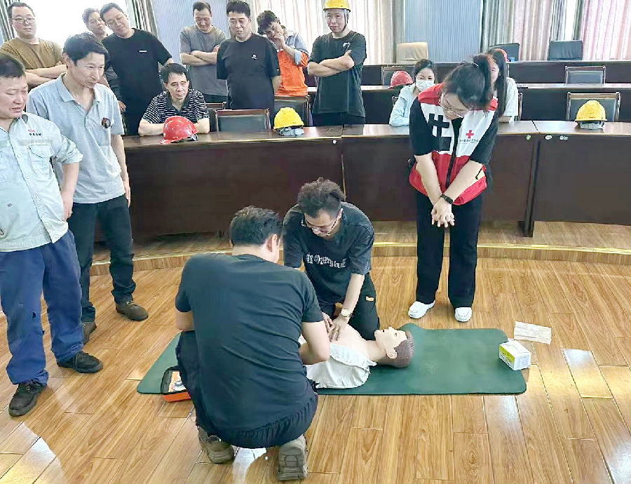 培训现场,红十字救护培训师结合行业风险特点,以真实案例和情景模拟为依托,深入浅出地讲解了心肺复苏术、创伤止血包扎、AED使用以及海姆立克急救法等技能。在实操环节,参训学员利用模拟人、AED进行分组演练,救护培训师对学员们的操作手法进行逐一点评,耐心纠正错误动作。