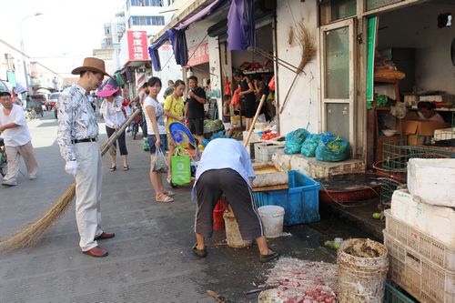 在一家理发店门口,一名店员正在店内打扫卫生,但是店外却是一地烟头。红十字会公共文明引导员对其进行了批评教育,使其自觉清扫了门前的垃圾,并表示以后会保证门前卫生。爱华弄菜市场前,摊主将卖菜摊点摆到了马路上,还有一名摊主在马路上进行屠宰,马路上血淋淋一片,红十字会公共文明引导员对他们的不文明行为进行了劝诫,责令他们即刻改正。