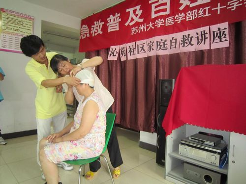 7月4日,博爱青春•苏州大学医学部红十字会“情系姑苏•爱洒吴门”暑期社会实践小分队的成员们顶着烈日来到了苏州工业园区沁苑社区,为社区50多位居民开展初级卫生救护培训,用自己的行动促进和谐社区建设。